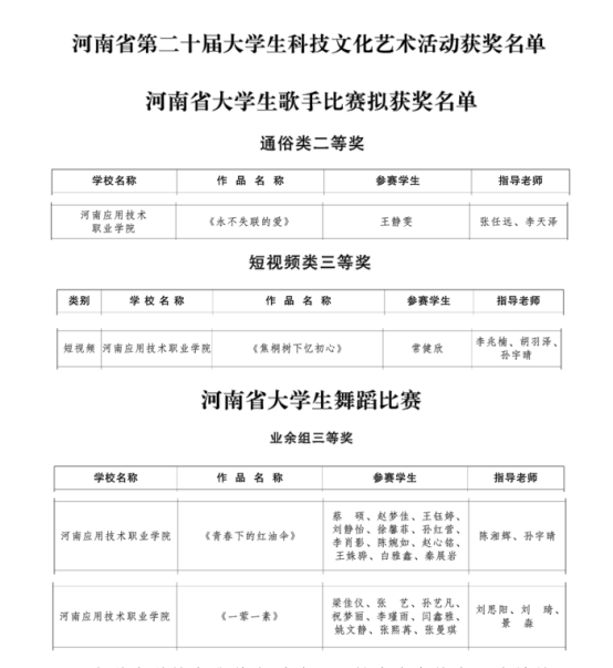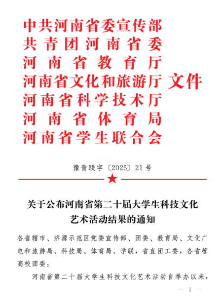 近日,由中共河南省委宣传部、共青团河南省委、河南省教育厅等多部门联合会下发《关于公布河南省第二十届大学生科技文化艺术活动结果的通知》(豫青联字〔2025〕21号)。我校荣获二等奖1项,三等奖3项。