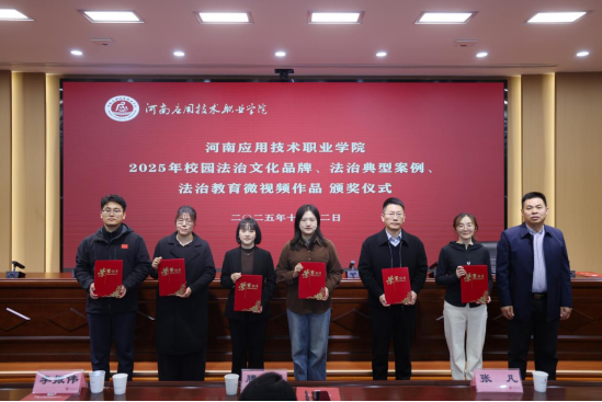会上,团委书记刘亚娟宣读了2025年校园法治文化品牌、法治典型案例、法治教育微视频作品评选认定结果,党委学生工作部部长李海涛为获奖教师代表颁发证书。