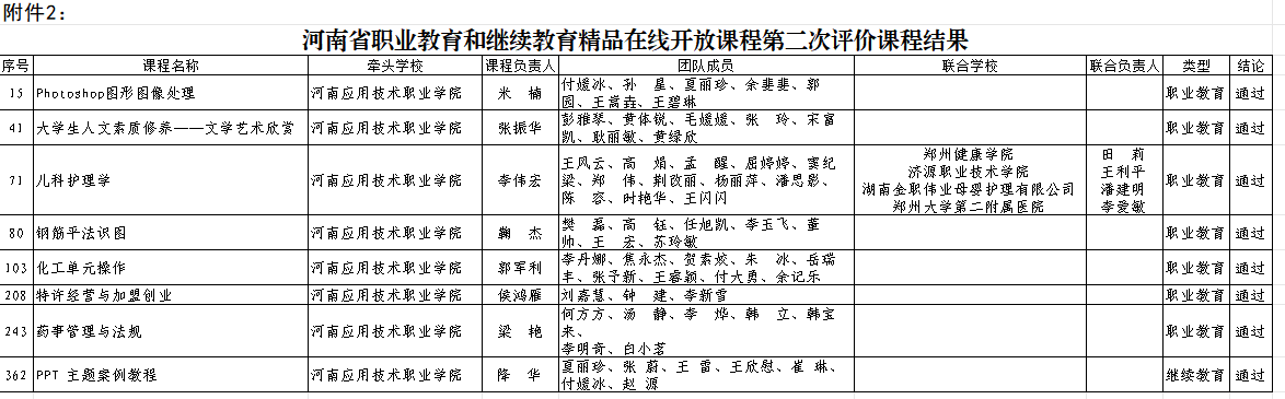 近日,河南省教育厅发布《河南省职业教育和继续教育精品在线开放课程评价结果和终身教育课程开发项目结项验收结果的通知》(教办职成〔2025〕323号),我校16门课程通过评审,其中8门2022年河南省职业教育和继续教育精品在线开放课程通过二次评审,8门2023年河南省职业教育和继续教育精品在线开放课程通过首次评审。
