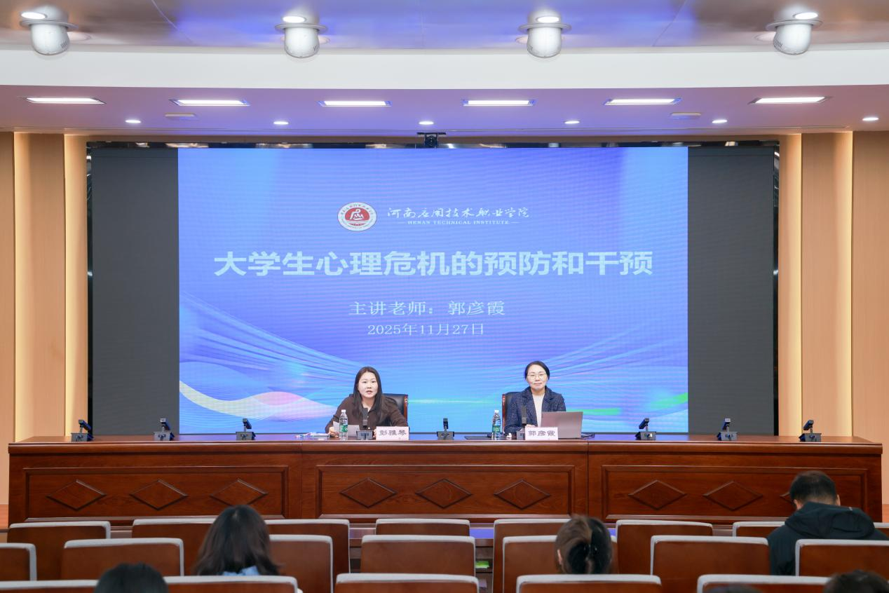为进一步强化我校心理育人工作实效,提升心理危机的预防与干预能力,切实筑牢校园安全防线,11月27日下午,我校特邀河南中医药大学心理健康教育中心副主任郭彦霞到校,在郑州、开封两校区同步举办了《大学生心理危机的预防和干预》的专题讲座。各学院(中心)书记、主任,副书记、副主任,心理专员及所有专兼职辅导员和心理健康教育中心专兼职教师参加。讲座由心理健康教育中心主任彭雅琴主持。