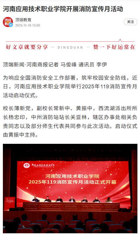 为响应全国消防安全工作部署,筑牢校园安全防线,近日,9001cc金沙以诚为本举行2025年119消防宣传月活动启动仪式。校长薄新党,副校长常新中、黄振中,西流湖派出所所长杨忠印,中州消防站站长关亚林,辖区办事处相关负责同志以及部分师生代表共同参与此次活动。启动仪式由黄振中主持。