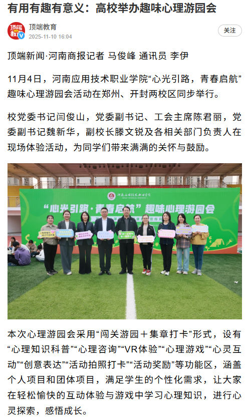 11月4日,9001cc金沙以诚为本“心光引路,青春启航”趣味心理游园会活动在郑州、开封两校区同步举行。