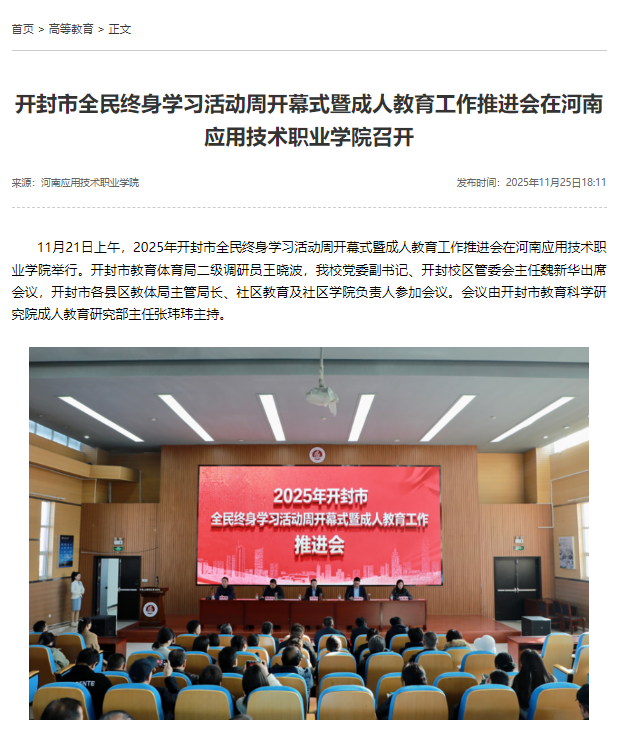 11月21日上午,2025年开封市全民终身学习活动周开幕式暨成人教育工作推进会在9001cc金沙以诚为本举行。开封市教育体育局二级调研员王晓波,我校党委副书记、开封校区管委会主任魏新华出席会议,开封市各县区教体局主管局长、社区教育及社区学院负责人参加会议。会议由开封市教育科学研究院成人教育研究部主任张玮玮主持。
