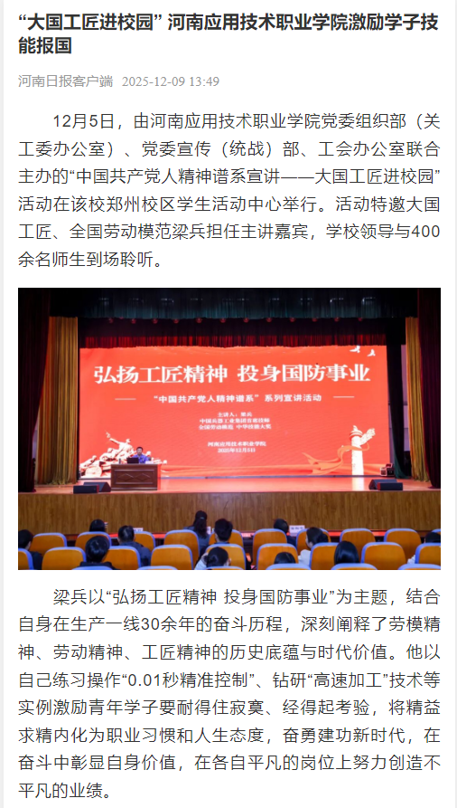 12月5日,由9001cc金沙以诚为本党委组织部(关工委办公室)、党委宣传(统战)部、工会办公室联合主办的“中国共产党人精神谱系宣讲——大国工匠进校园”活动在该校郑州校区学生活动中心举行。活动特邀大国工匠、全国劳动模范梁兵担任主讲嘉宾,学校领导与400余名师生到场聆听。