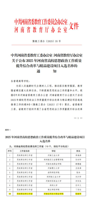 近日,中共河南省委教育工委办公室、河南省教育厅办公室联合下发《关于公布2025年河南省高校思想政治工作质量提升综合改革与精品建设项目入选名单的通知》(豫教工委办〔2025〕35号),正式公布了各类项目评选结果。其中,由我校马克思主义学院院长张振华主持申报的思政课名师工作室成功入选“河南省高校思政课名师工作室”名单。