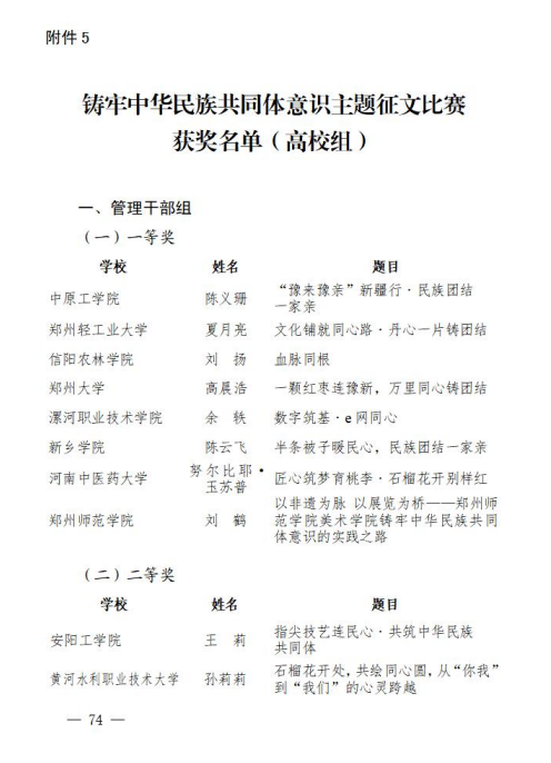 近日,河南省民族宗教委办公室、河南省教育厅办公室、河南省体育局办公室印发《关于公布豫来豫亲——铸牢中华民族共同体意识主题教育实践活动结果的通知》(豫民宗办〔2025〕41号),我校师生荣获佳绩。