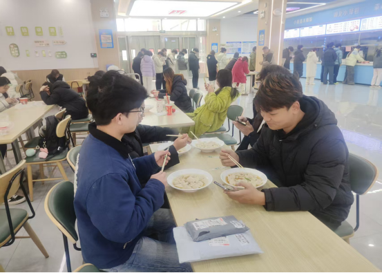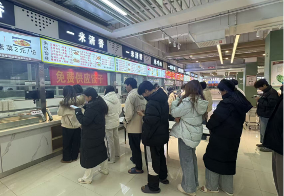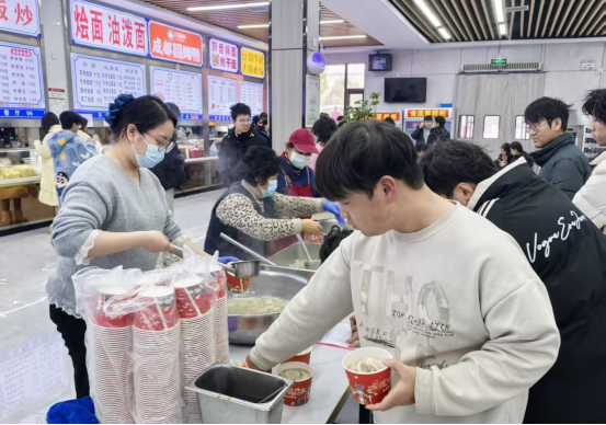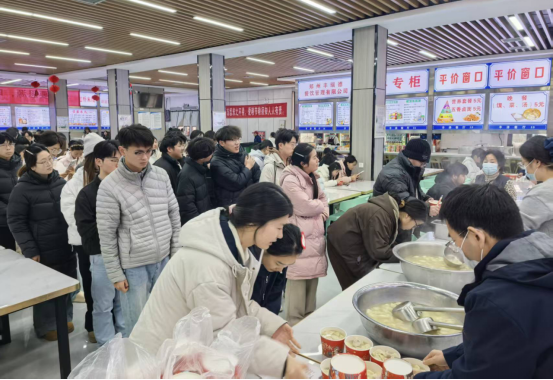 午餐时段,活动如期在三校区7个食堂展开。闻讯而来的师生们有序排队,脸上洋溢着期待与喜悦。工作人员热情地将一份份热气腾腾、香气扑鼻的饺子递到师生手中,并送上“冬至安康”的诚挚祝福。现场气氛热烈而温馨,欢声笑语与饺子的香味交织弥漫,驱散了冬日的寒意。